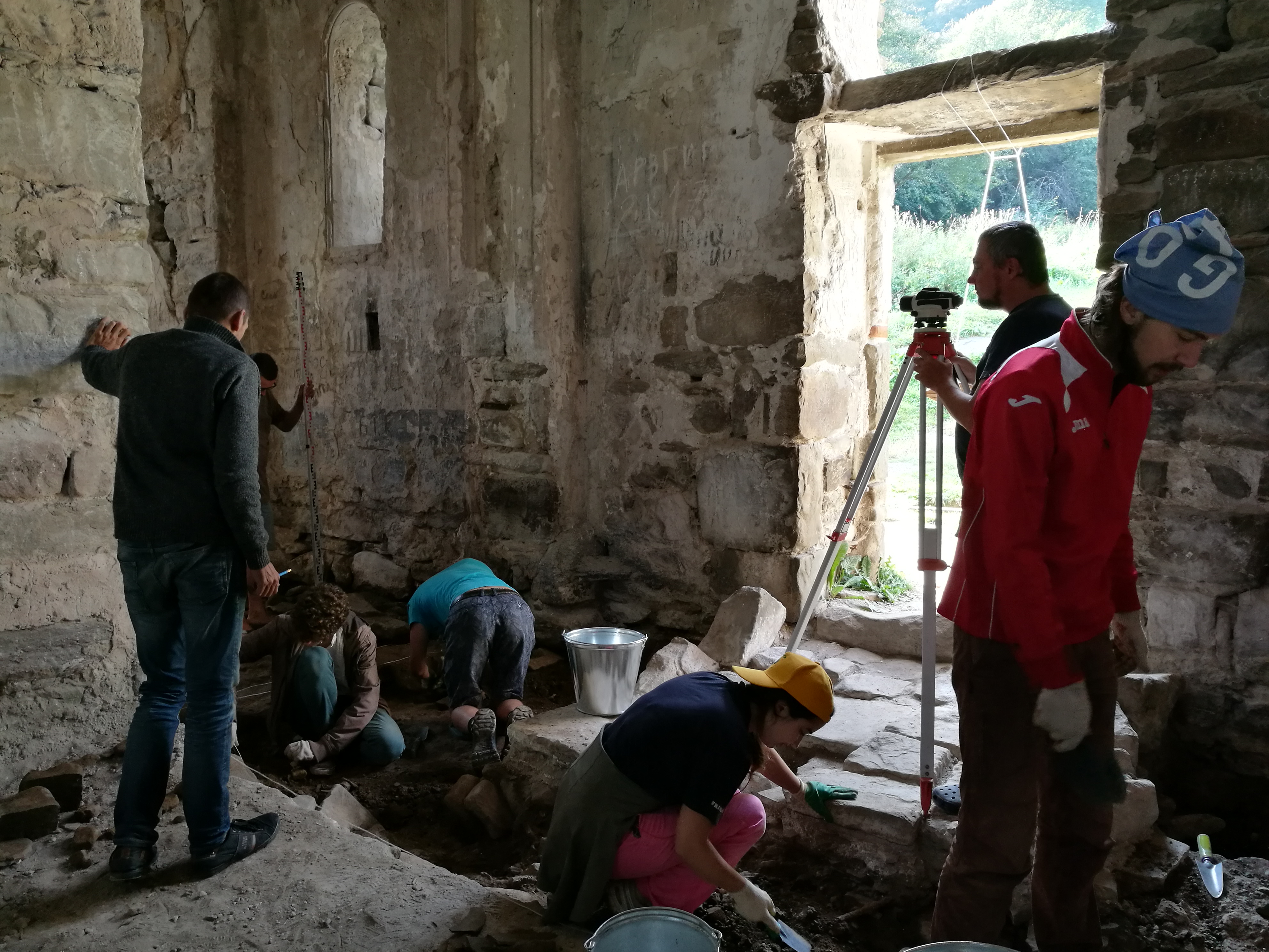 В результате работ в Среднем храме стало ясно, что древний пол был практически полностью разрушен в ходе монашеской реставрации XIX в: несколько фрагментов двух древних полов, известкового и цемянкового, удалось обнаружить в ходе раскопок. Работы в храме вместе с тем дали возможность увидеть технику его кладки и устройство фундамента, более глубокого в западной части южного рукава. Помимо этого, были найдены фрагменты осыпавшихся оригинальных фресок и осколки керамики, в том числе поливной.