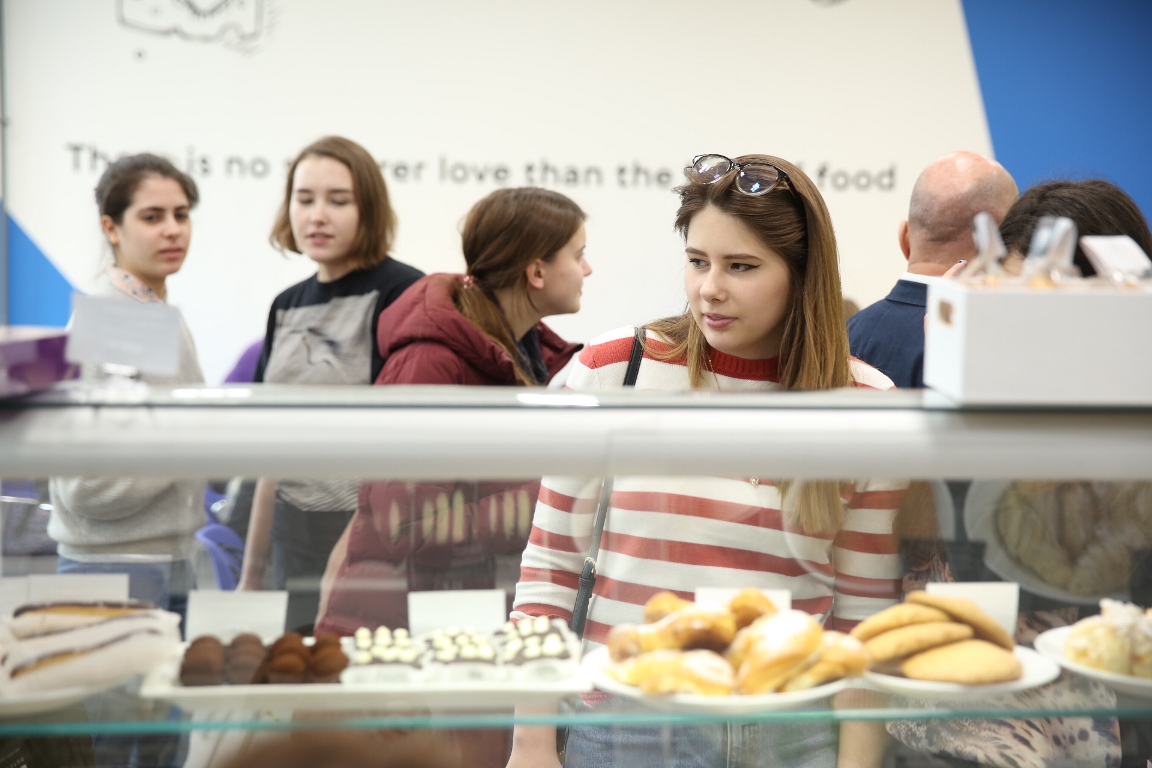 «Завтрак начинается в 8.30, заканчивается в 11.30 и переходит в обед. Мы делаем сырники из натурального творога по специальному рецепту, где в них не добавляется ни мука, ни манка. Если студентам будет интересно, мы всегда можем все показать и провести мастер-класс. Все десерты делаются в нашем кондитерском цехе из натуральных продуктов: это и зефир из черной смородины, и мармелады, есть диетические и вегетарианские сладости, печенья с вялеными томатами, с пармезаном и со шпинатом. Также можно прийти и собрать себе пасту — выбрать пенне, феттучини или спагетти, а к ним добавить бекон, грибы, сливочный или томатный соусы. А на второй этаж можно прийти на ланч. Там всегда будет большой выбор блюд — четыре недели меню не будет повторяться».