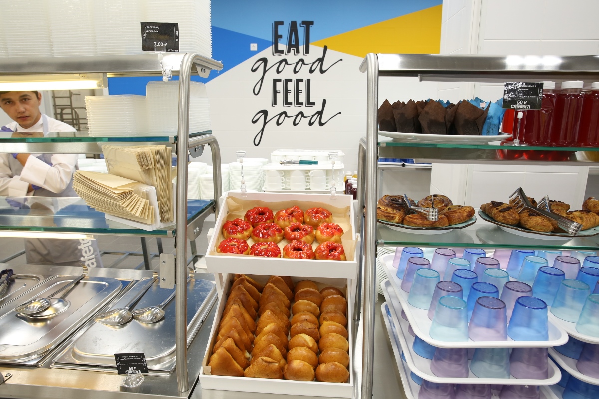 Столовая теперь занимает два этажа в корпусе «Л» на Старой Басманной. По сути это два отдельных зала с разным оформлением и разными концепциями. Первый этаж — зона специальных предложений: бургеры, пицца, паста, блины, фрукты и кафетерий. Она будет работать с 8.30 до 17.00.